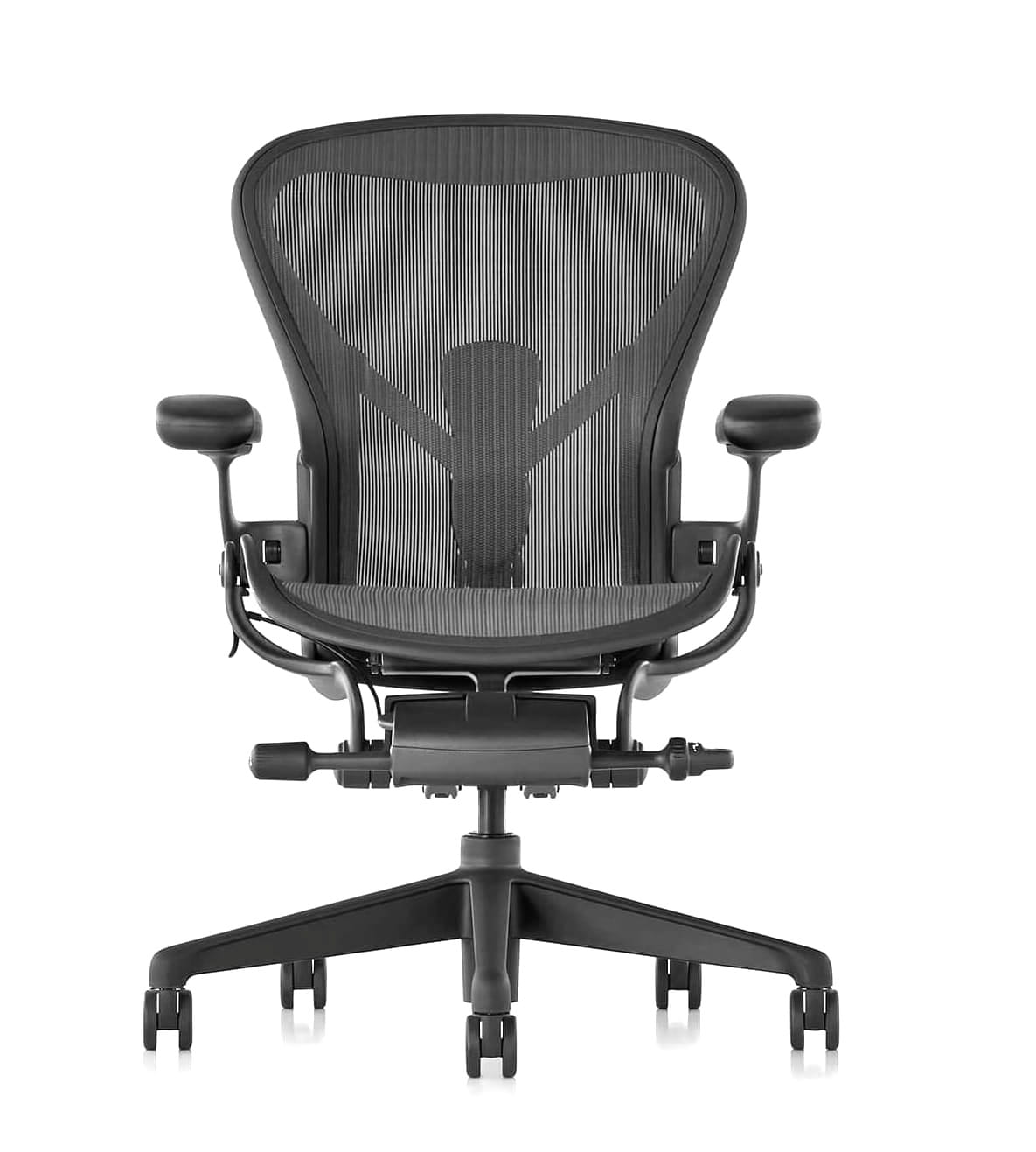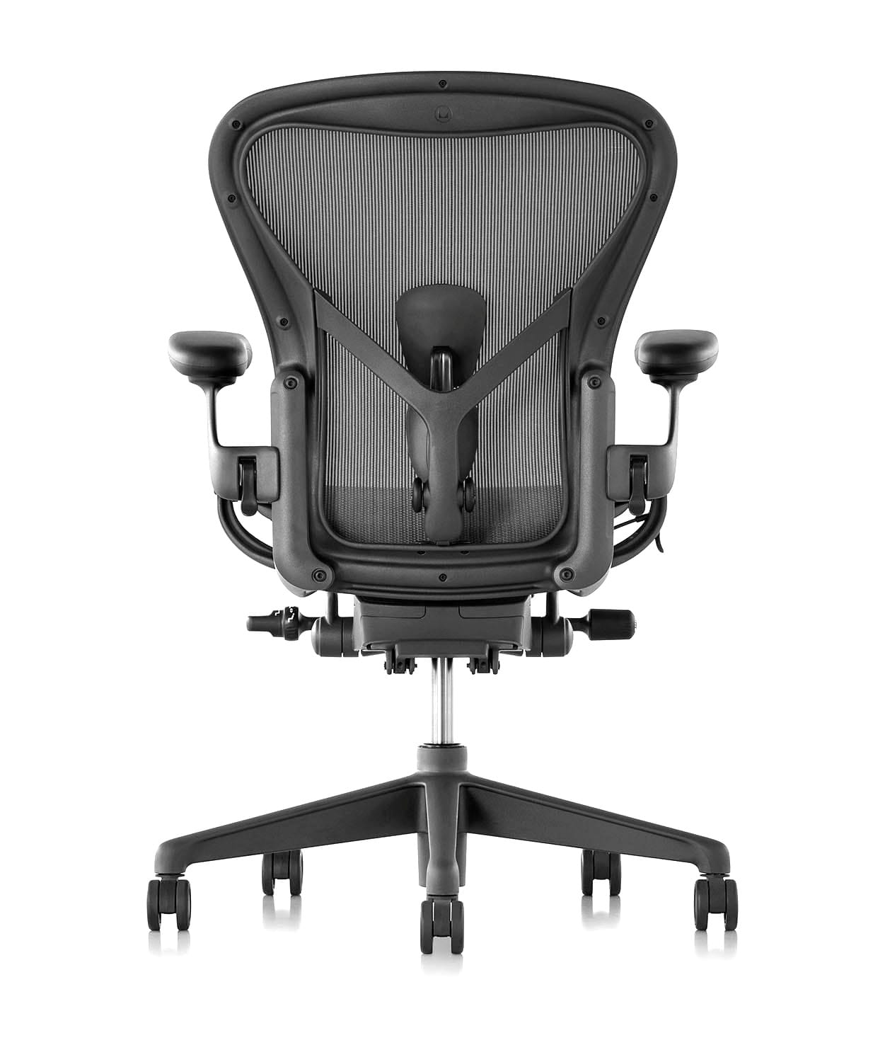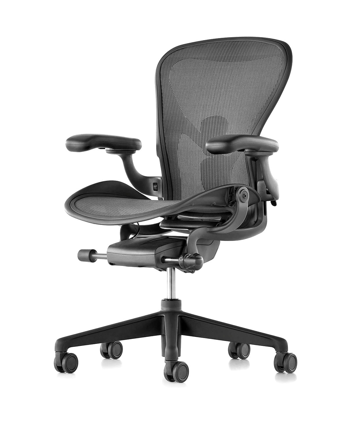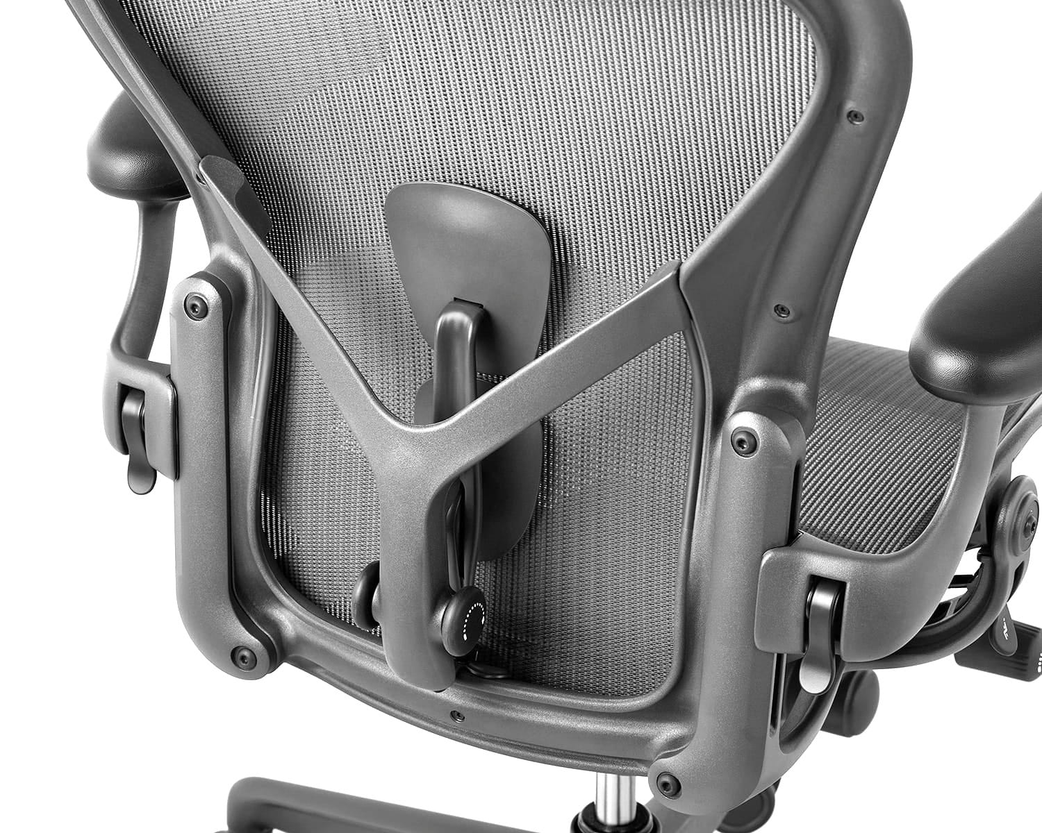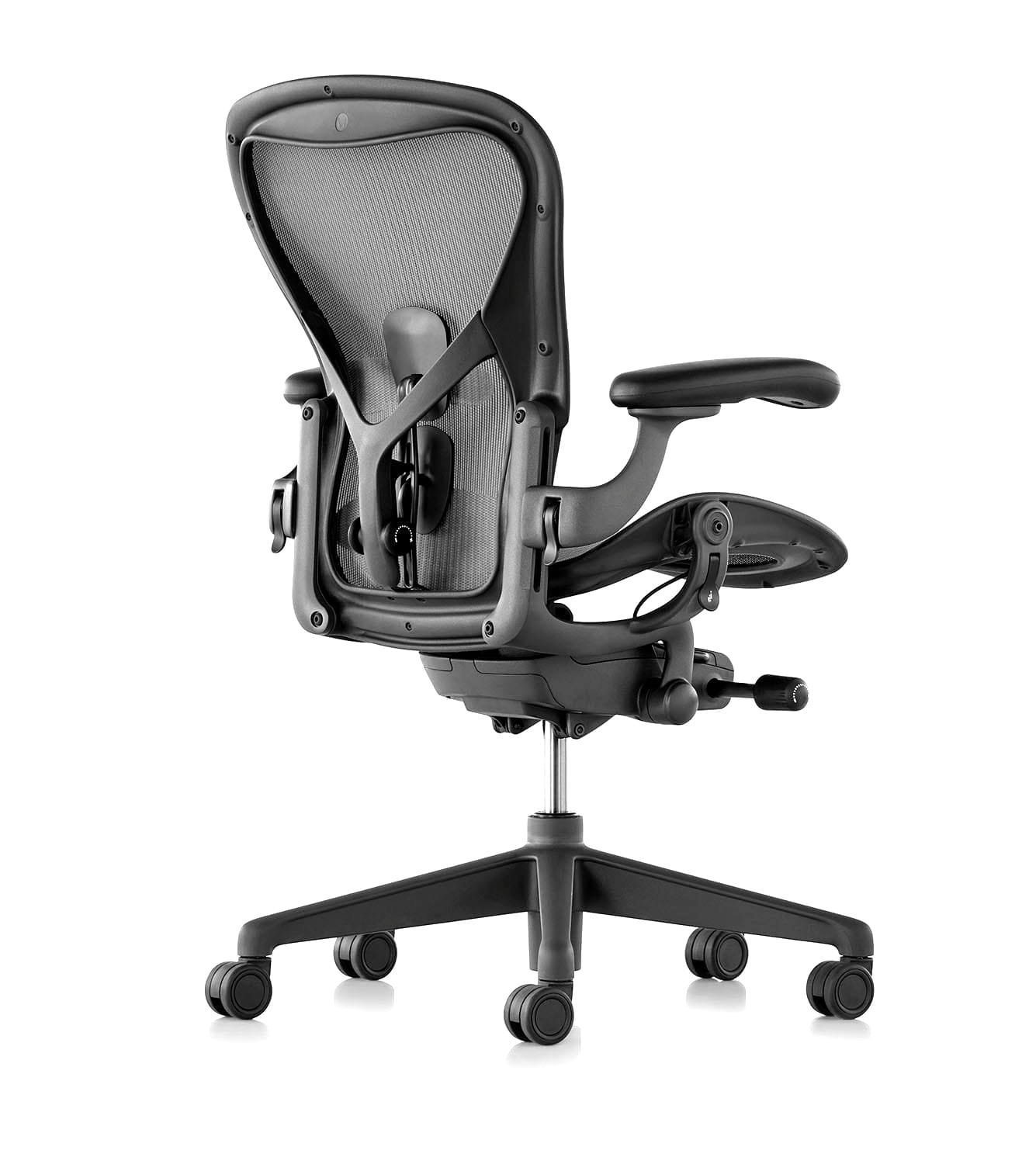 Krzesło biurowe Aeron zrewolucjonizowało siedzenia biurowe dzięki swoim charakterystycznym cechom konstrukcyjnym: pionierskiemu materiałowi Pellicle i opatentowanemu podparciu pleców PostureFit SL, które zapewnia idealną pozycję — klatka piersiowa z przodu, ramiona z tyłu, miednica lekko pochylona do przodu.